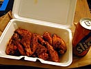 i walked to harvard square to take the 66 bus into allston center, going over to dan's place to watch game 1 of the red sox athletics playoff. i got an order of wings before i went up to the apartment, overpriced small wings (spicy teradactyl flavored) but i was hungry so it tasted pretty good nevertheless.