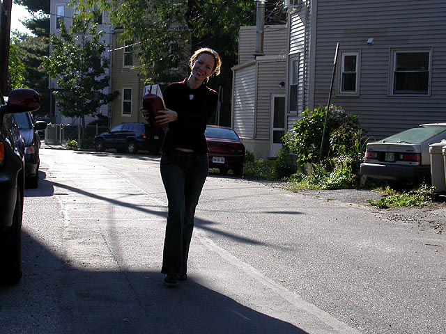 in the afternoon i went running with kristine. both of us were badly damaged from our previous runs, both walking around the office with limps. she had something wrong with her hip, i had some pain in one of my ankles. any discomfort disappears when i run though, which is weird. even though there was a chill in the air (temperature in the 50's), i still ran in shorts and t-shirt. i will continue to run like this until the temperature drops to freezing. we ran our usual along the charles, going straight down storrow drive until we got to the exercise station, where we did a few situps/pullups/pushups. we ran behind two girls, one of which was wearing a string-bikini top despite the nippy weather. i watched a man slow down his car on busy storrow drive to honk his appreciation. days like this, i kick myself for not having my camera.