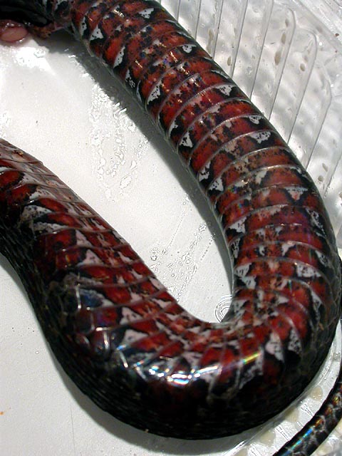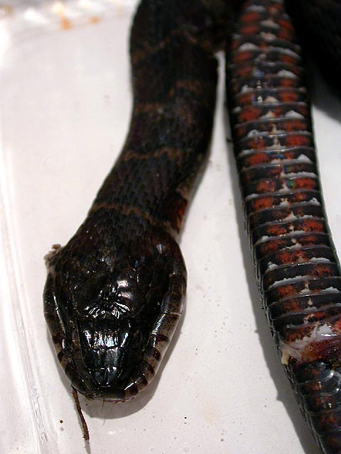 julie also showed me a snake she had found this past weekend which she kept in a box in the back of her car. we identified it as a northern water snake, it was a big snake, died from an apparent road injury. beautiful red/black/white scales, smells like rotten fish though. julie wanted to throw it away at my place, maybe toss it in the backyard, but i told her no way, she had to dispose of the body herself.