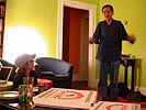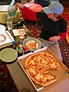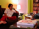 as soon as we got back to my place, i called julie to let her know i was home and that she could come over. alex gave me a present, this usb-powered desktop fan shaped like a cat sitting underneath a tree. i went down to the street corner and ordered some pizzas, then julie arrived with her radio so we could listen to it while we watched the game. we saw the start of the first inning at the pizza shop when we went to get our food. alex left after a few innings when he finish his pizza.