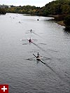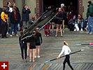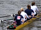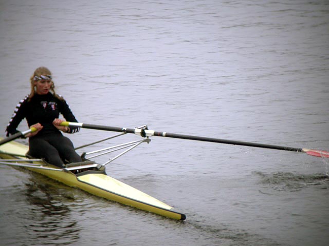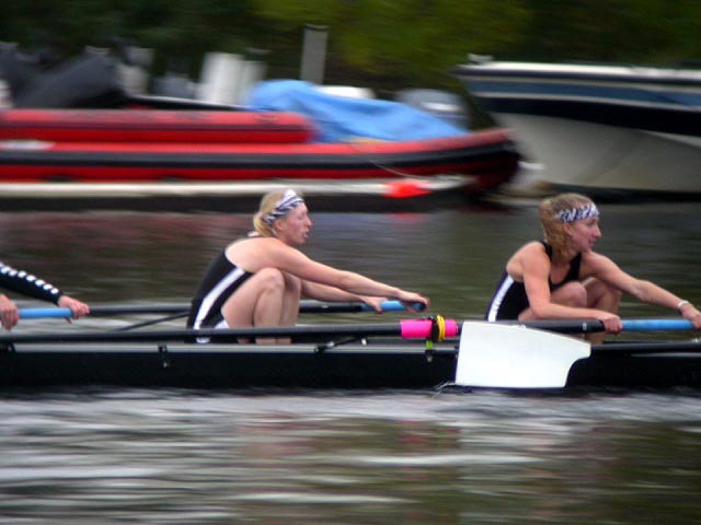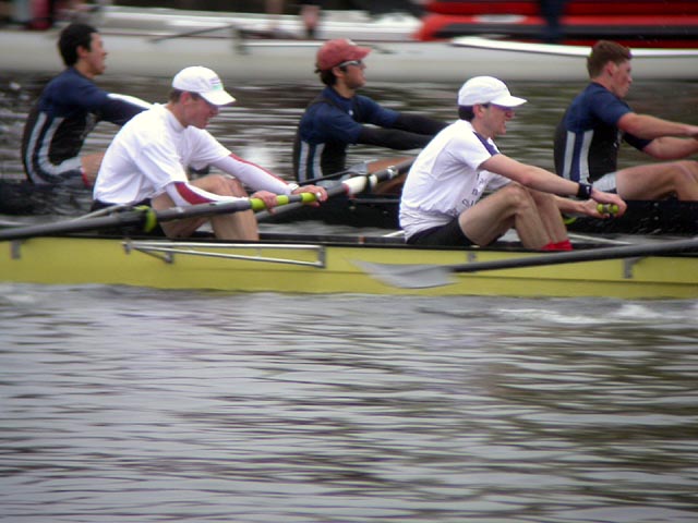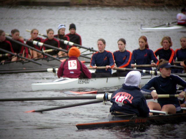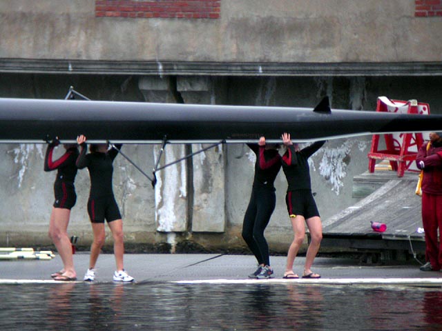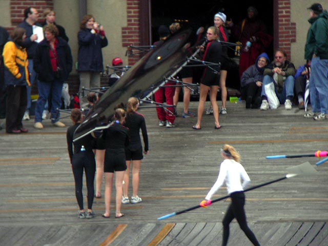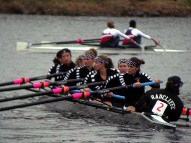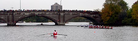 clad athletic hotties strain and groan on the charles river? from memorial drive i could already see the boats (they're not called boats, but i don't know crew lingo so it's "boat" to me) racing on the river. i got a good vantage point on the jfk street bridge and watched the boats go by down below. i had to open up the umbrella because it was drizzling slightly and i didn't want to get the camera wet. because of the overcast, lighting condition was terrible and most of the photos i took turned out to be blurry. later i moved along the banks of the river to get sideview photos of the boats. most of the women teams dressed in matching outfits while the male crew teams often times paid little attention to what they were wearing.