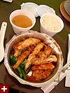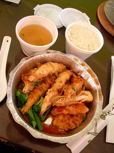 i logged online and julie was quick to write to me to let me know her yearning for tempura. she came by to pick me up and we went to the porter exchange, where we both got the spicy chicken tempura takeout.