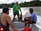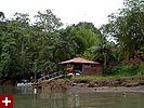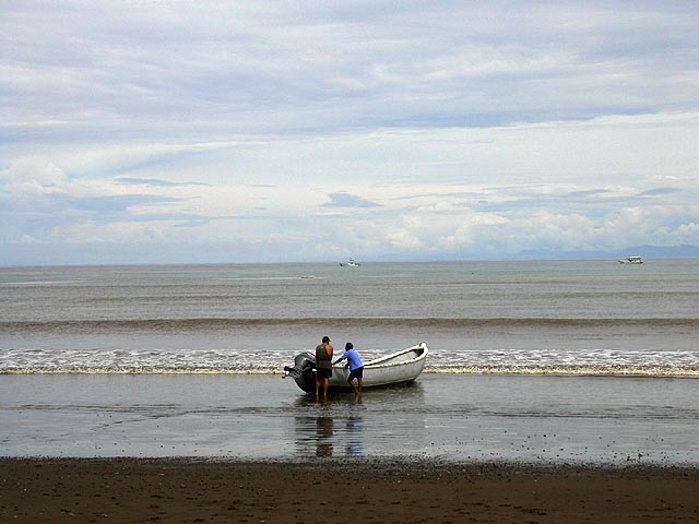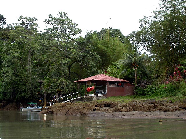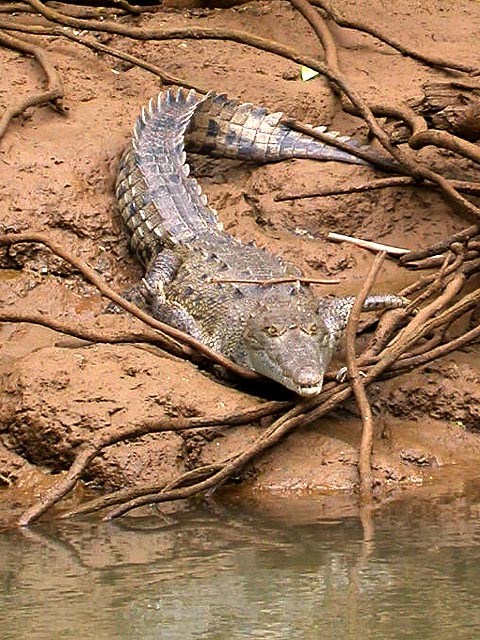 that was just one of several rivers we crossed. finally we stopped by a beach, with no resort in sight. i thought maybe this was some sort of scenic rest stop, but the driver told us to follow a man who was carrying our luggages onto a motorboat beached on the shore. a boat ride to take us to the resort! i didn't remember reading about this in the description. we rolled up our pants, took off our shoes and socks, and followed the captain into the boat, where we went across drake bay to the eponymous resort along the edge of a small river. on the riverbank was a baby crocodile sunning itself, about 3 feet long. none of the native costa ricans on the boat bats an eyelash.
