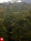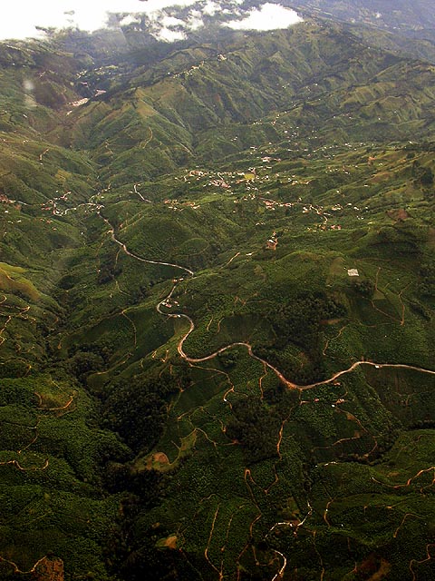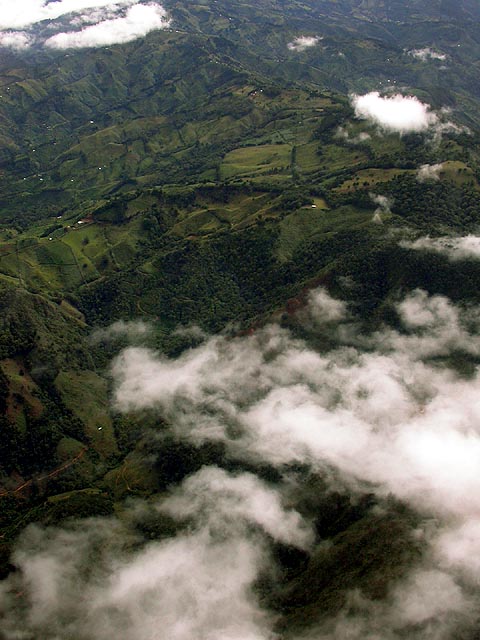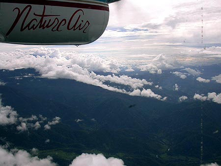 (the actual luggage was 14 lbs, but my carry-ons were 21 lbs). a rather large woman who was ahead of us in line got incensed when the airport guy asked her to get on the scale so she could be weighed. "no way," she said, and started shaking her head and waving her hands in defiance to flight safety. her husband had to coax her into doing the right thing. at 8:30am all the passengers boarded the plane, a twin-engine propellered twenty-seater, a row of single seats on the left, a row of double seats on the right. my father and i were one of the first few people to board and both of us grabbed left-facing window seats. our flight attendant was also our co-pilot, she briefly went over the safety rules, and we wheeled around the runway for the takeoff. from the window of i could actually see one of the wheels of the plane lift off from the ground as we became airborne.