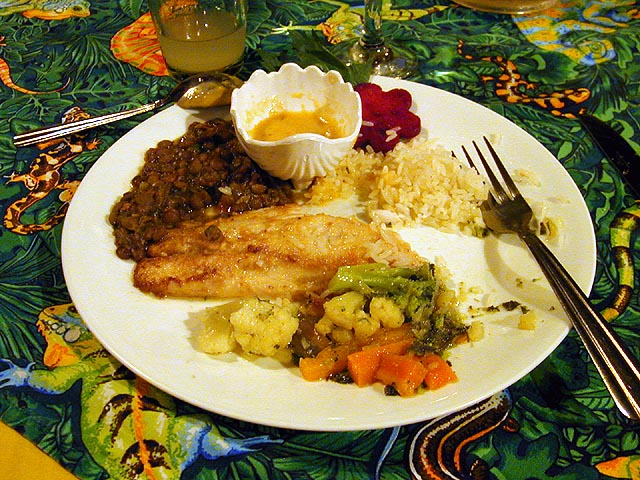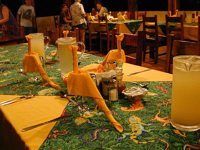 after only two hours of sleep (i think i'm only allowed to sleep for two hours), my father woke me up to go down to the dining hall for dinner at 6:30pm. it was dark outside and we needed a flashlight (in my case, the ultra bright LED headlamp). fireflies winked on and off in the darkness, the first time ever i've seen fireflies in action, and they made my father nostalgic about his days as a boy growing up in taipei. we were first two there and sat down, soon joined by john and maggie, then the two blondes living two cabins down from ours. the girls had been out at sirena today, one of the places in corcovado you can visit, and were talking about the animals they saw. i was busy hydrating myself, drinking as much fluid as possible. maleni came around, asked us how we were doing, and took our order for what we wanted to do tomorrow, which was to visit caño island.
