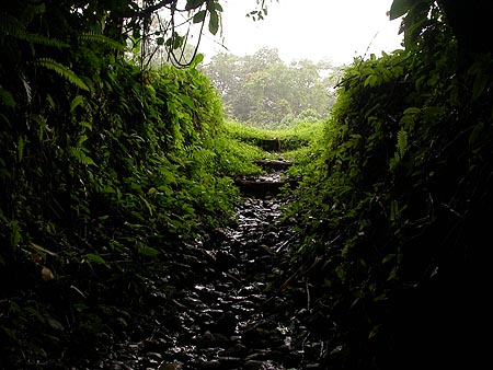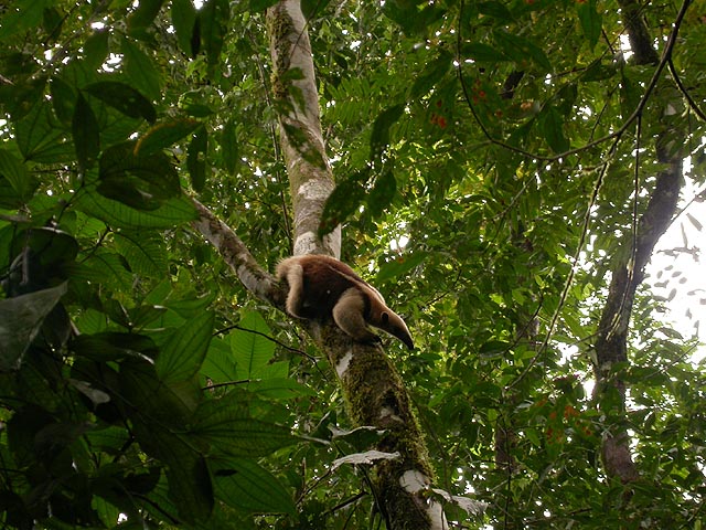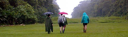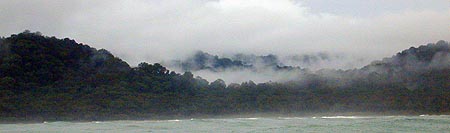 the boat trip down to sirena would take 1:20 hours through some very choppy water. our boat captain must've been a seasoned fisherman because he navigated the ocean as if he owned it. we were basically surfing the waves with the boat, steering in a zigzag pattern. it was raining like crazy, and i started to have doubts about if we'd see anything at sirena, whether it would be like yesterday, trudging through rain. the only thing poking out of my poncho was my head, and it rains so much i couldn't even breathe. it was a miserable hour and a half. when we finally got to the shores of sirena, the captain shut off the engine and slowly started attacking the waves, approaching the rocky shores.