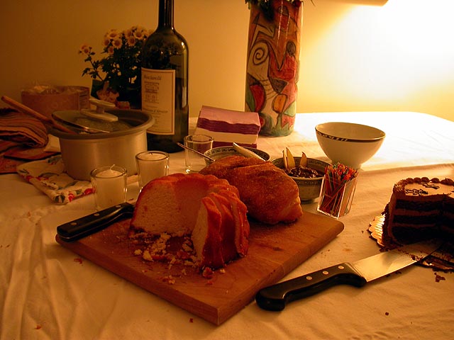 the first to show up that i knew besides lisa was roy, one of the freelance lingo programmers that srm hired for some contract work. we talked shop, two programmers chatting about the stuff that they've been working on. i talked with another guy, forgot his name but he lives at the piano factory, about how advances in technology help humanity as much as they hurt it, then about apple, both of us being mac users. pierre was a belgium man with a french accent, his interesting story was how he went to afghanistan twice in the late 80's, amongst other exotic countries. scott arrived with girlfriend robin, and roy came back to entertain us more with his stories, including how he used to drive a taxicab in order to make enough money for rent, and how he purposely rammed a trolley car full of drunk frat guys one time. i left around 11pm, the temperature outside brisk, an empty house awaiting me.