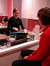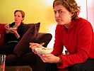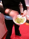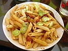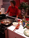 mandy wanted to cook a recipe she had learned on her recent vacation to italy, some sort of spicy bacon pasta with a side dish of fennel salad. something about bringing back recipes from distant lands seem very exotic. most people bring back souvenirs or photos, but how many people bring back the flavor of another country? we were assigned little side jobs, mandy's friend (sorry, i forgot his name) grated the cheese, i chopped the onion (tearing, naturally), and julie minced the garlic. at 9pm i dropped everything and went into the living room to watch 24 while everybody else was still cooking in the kitchen. a man's got to have his priorities!
