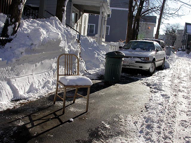 it's a real problem living in the city, you spent 2+ hours digging out a curb side parking space so you some how feel that spot belongs to you, so you put a lawn chair or maybe some garbage cans in its place when you leave, to tell other people that's your space. thing is, there's no curb side parking ownership, but god forbid if you happen to park in somebody's spot, because there's a million stories about smashed windows and other forms of car vandalism in retaliation.