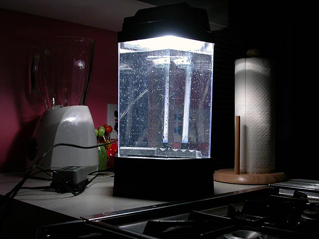 i tested the mini-aquarium before i went to bed, filled the thing up with tap water, ran the filtration system. i need to get a heater for the tank as well, it didn't come with one. i envision a lot of aquatic plants and perhaps 4 fish maximum (i probably can't get anymore, the aquarium isn't big enough to sustain anymore), red ones to contrast with the green.