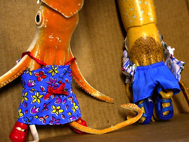 carly and i dressed two of the rubber squids from the office. i have them posed inside of an empty cardboard box, just so i could get a feel for the final look of the photos i'll be taking of the squids for next week. the squids didn't look so bad all dressed up in tiny doll clothes. i can wait until we build the miniature diorama set for the squids, i'm spending all weekend searching for items to include in the scene.