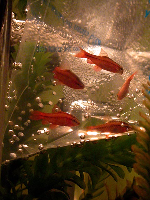 i decided to go for the bargain fish, $4 for 5 cherry barbs. they're tropical fish, but i'm hoping they're hardy enough to take 60 degrees water temperature. the boy scooping out the fish for me was kind of rough with the animals, putting them in a plastic cup then dumping them into a plastic bag. i could imagine all sorts of other animal abuse that goes on behind closed doors. i also got an aquarium net and a container of fish flakes. when i went to go pay for my stuff, the total cost was more than i thought. "how much are the fish?" i asked the cashier girl. turns out you only get the $4/5 deal if you use your petco card, which i didn't have. i asked if i could apply for one and get the discount, and she seemed kind of annoyed by it all, and then pulled out two forms from a drawer, "fill out this form, and that form," she said, slapping a pen on the counter while she redid my purchase. after i finished the forms, she asked me, "did i give your money yet?" "huh?" i said, not hearing her question. she repeated herself again, this time louder and slower, like i was retarded. "oh, no, not yet," i replied. like i said, not the most courteous service today!