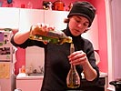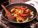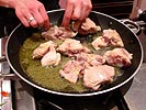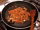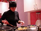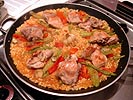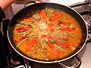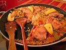 i changed into an all-black ensemble before eating it though, i didn't want to get any of that red fruit juice staining my clothes. it tastes like cranberry, but not as tart, and the pulpy seeds are like corn kernels. paella calls for saffron, which i've seen before but never smelled or tasted. it's a very subtle spice, reminds me of the air inside of a brand new tupperware container, plasticky. the paella pan looks like an oversize frying pan. too flat to be a wok, too big to entirely fit on one burner. when you're not using it to cook, i think the paella pan can be used as a shield. paella also traditionally calls for seafood, but there was only chicken in tonight's version. julie had some problems with the artichokes, the recipe called for artichoke hearts, she cut out enough of the artichokes that we had maybe a few slices left - they're a difficult vegetable to work with!