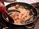 julie was coming over to make paella, which she had been raving about since early december, before she got her paella pan for christmas. to continue the spanish theme, she asked me to make flan. i tried a new recipe involving two cans of condensed milk with equal cups of whole milk as well as lime zest. i didn't have enough eggs (just 3), but made do anyway. the condensed milk was thick, like a syrup, i could just imagine the flan to be mouth-numbingly sweet. i also melted the sugar with 3 tablespoons of water, which did a lot of bubbling but finally turned to caramel after a long burn. by the time julie showed up at 8pm, the flan was just about to go into the oven (350 degrees for an hour).