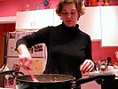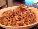 julie came over in the evening to watch the state of the union address. she cooked up some mushroom & chicken sausage risotto, finished just in time for bush's speech at 9pm. red tie instead of blue! we spent the night heckling the president. i particularly liked how he singled out steroids use in professional sports as a cause that america should be fighting against, and then the camera pans to patriots quarterback tom brady. i guess bush doesn't want any carolina votes. steroid abuse? yes, that's more serious than the fact that the entire world hates the united states, terrorism is rampant, and the economy still sucks. nice job! and kids, say no to drugs and premarital sex and stay away from gay people and believe in god. we finished off the evening with the daily show, even funnier now in this election year, i watch it instead of the real news, politics is a great big joke anyway.