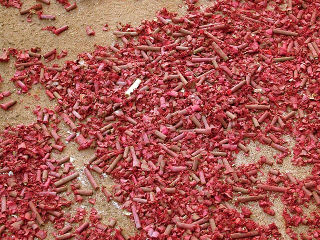 smoke only gets like that when it's really cold, instead of wispy, it has a definite shape, just like the condensation that comes out of your mouth. i could spent a whole day out in the could playing with my breath. let it not be said that i can't make my own fun! the streets approaching chinatown was littered with the tattered red debris of new year firecrackers.