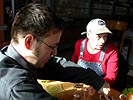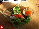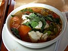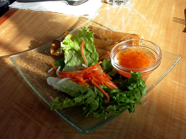 we ordered appetizers and i got myself a glass of iced green tea and a bowl of hot and sour soup with tomatoes, pineapples, and chicken slices. i've never had it before, and i thought it'd be like pho, but the soup was actually served with a bowl of rice, which i mixed together to form a porridge. it had the makings of tom yum guy, but the pineapples made it too sweet for my taste. there was a big debate as to whether or not the spring rolls contained shrimps, in which case adam wouldn't be able to eat them without suffering some allergic reactions. after we all finished eating, the waitress came around and left the check next to james since he was the most smartly dressed individual at the table, figuring he'd probably be the one footing the bill. instead, birthday boy paid for our meal.