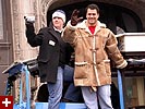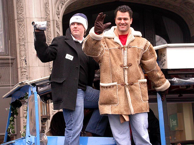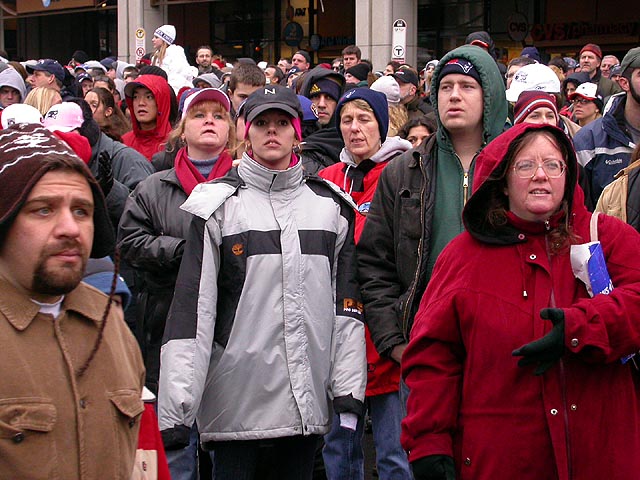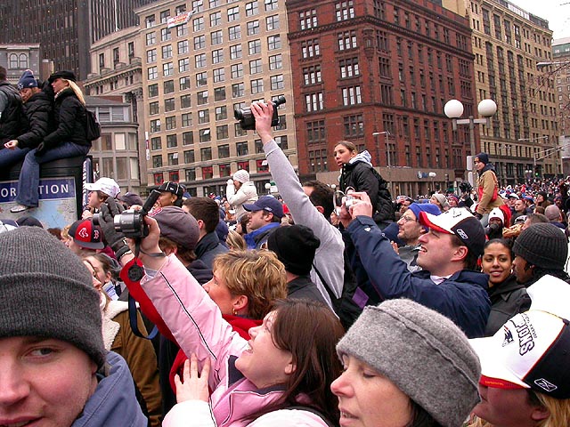 government center was crowded but it wasn't that bad that we couldn't slowly squeeze closer and closer to the heart of the city, where the owner and the coach and the players were thanking the fans, everything played back on a large jumbotron (there was another jumbotron in boston common, but it was no where the size of the one in city hall). there was trash everywhere, which goes to show that human beings are basically dirty animals, especially in large groups. kristine was joking that i should clean everything up because she believes i have OCD since i wash my hands every morning when i come into work (hey, i don't want to get sick, the trains are full of germs!). i bumped into the joel doppleganger. long story, but i see this kid everywhere. the very first time was back in october when i saw him at spooky world (john and dan will vouch that i am not lying), then i saw him a few more times around town, at coolidge corner, and now i see him (and his group of friends) at the superbowl parade, totally freaky. i've been trying to get a photo (to prove i'm not lying) and i finally managed to do it.