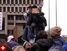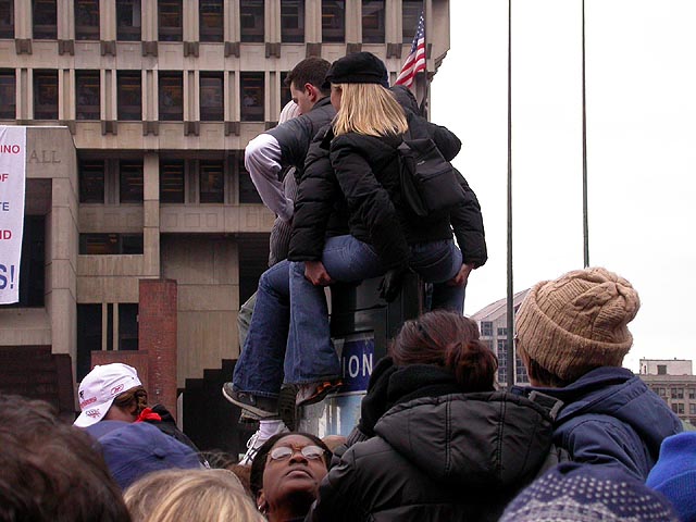 after the procession, we, along with everybody else who was standing with us, walked towards city hall for the speech. the streets were a sea of heads, and there was a heavy police presence (as well as there should be, with 1.5 million people estimated to be at the parade). walking by suffolks law, the place was covered in shredded papper confetti.