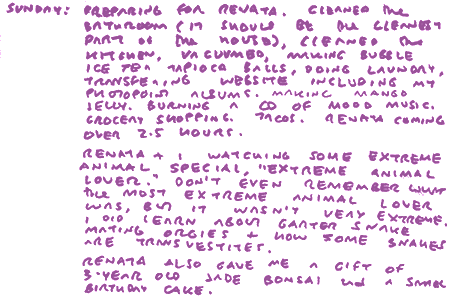 we watched some special on animal planet about the most extreme animal lover. i forgot what the number one most extreme animal lover was, but i did learn that there are transvestite garter snakes. we also saw some surreal life, one of those shows that's so bad you can't stop watching.