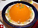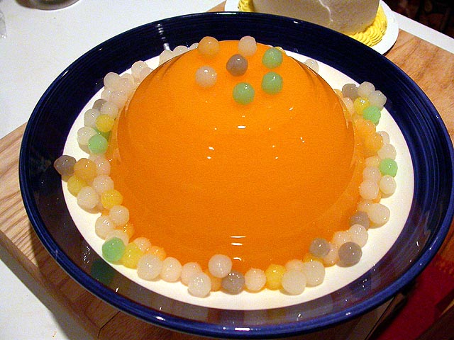 steeping two tea bags per glass of boiling water (there was enough to make 3 glasses worth). after they had some time to cool off, i poured them into an empty plastic juice container and let it refrigerate. i made some mango flavored gelatin, pouring it into a small round bowl.
