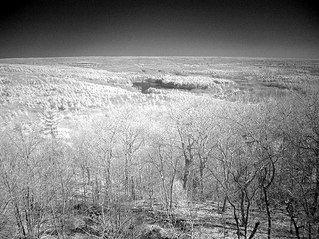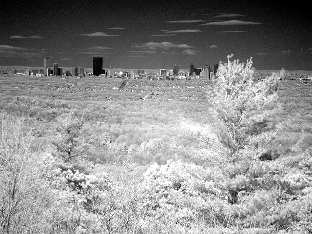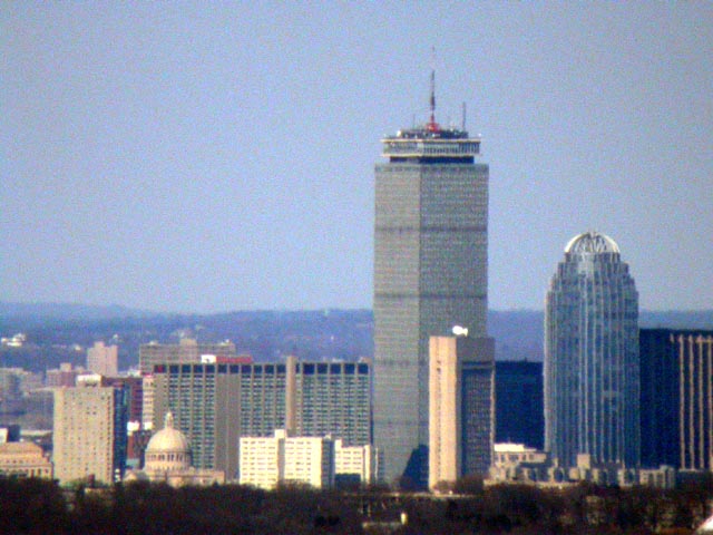 we passed another pond (large, and filled with vegetation), before getting to point 1083, where we scaled the great blue hill (635 feet), following the more challenging blue dotted trail. at the top of the hill was eliot tower, where there was a view of boston. i took some infrared shots and a few 32x monocular photos. i don't think i've ever seen boston from this side before, usually i catch it from the north (from the mt.auburn cemetery tower), where i could also see cambridge.
