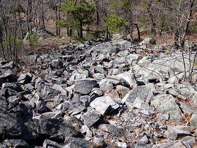 dotted with shrubby evergreens, possibly pitch pine. some of the rocks were covered in either lichen or moss. looking at the landscape, i imagined that during the summer the place would be crawling with rattlesnakes coming out from their burrow between the rocks to sun themselves, and for once i was glad it was winter. coming down some children saw us and asked their mother if they could come up as well (we're not very good influence with kids).