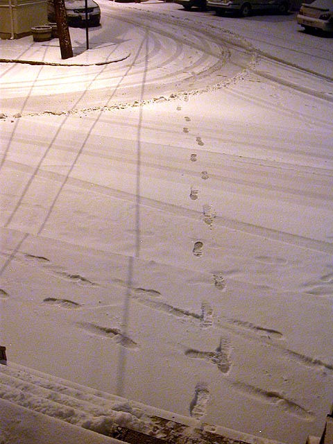 wouldn't you know it, as soon as i got back to the office, it started snowing. just a little at first, then gradually increasing, until it looked like it was "raining" snow. when i went home, the snow came down as painful crystal shards of ice swirling around the air.