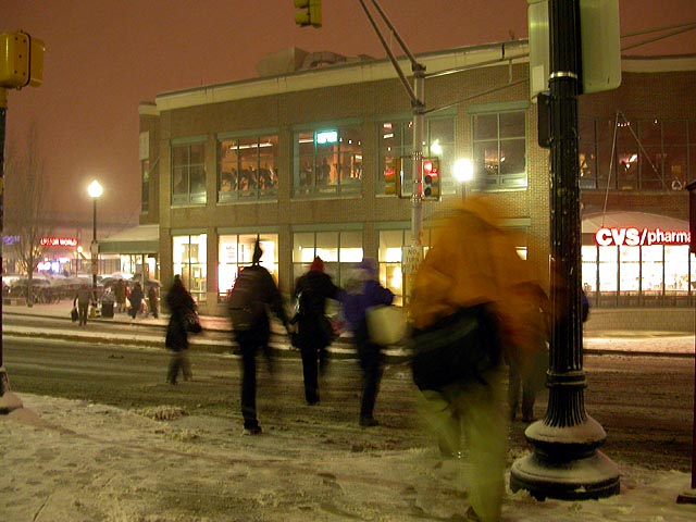 after dinner, i left with julie, she went home, i trudged my way through the snow down to the charles river, looking for photo opportunities. conditions were terrible, wet and windy, snow blowing everything, hard to keep the camera dry. there was really nothing to see, and i ended up taking the last outbound train to porter square. coming back home, i shoveled the sidewalk before finally getting out of my wet clothes and preparing for bed.