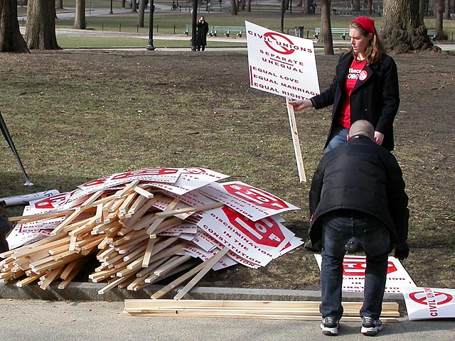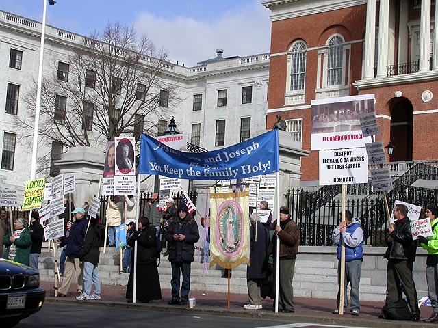 i remember it took forever, and one of the reasons was my dilated pupils. this time around, the exact same route, seemed very short. when i got to the state house, it was already crowded with people demostrating their support or protest of gay marriage rights in massachusetts. it's not even 9am and these people are already out, what dedication!