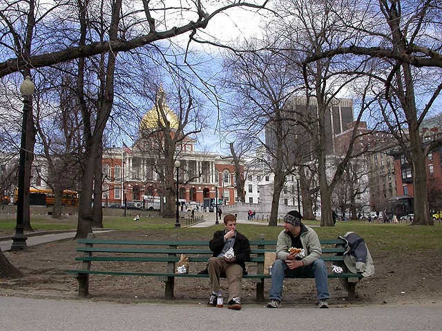 we ate in boston common, along a stretch of road flanked by park benches, facing the state house, it's golden dome glistening in the sun. the weather for some reason wasn't as warm as we thought it'd be, but we braved it nevertheless. she asked me what book i've been reading ("good omen", i said (about a reluctant antichrist), while she's working dave eggers' "you shall know our velocity") and whom i'm voting for in the presidential election ("i'm a registered democrat," i told her). further away, two drunk homeless men were talking loudly.