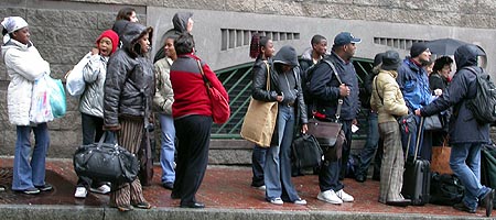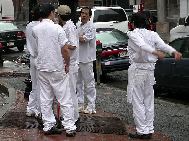 i left my phone number and e-mail and she told me they'd contact me in a few days after an investigation. as long as i'm not going to incur any sort of fee or penalty, i really don't care. coming back, i wandered into the secret space where the people taking the chinatown buses having been hiding. a group of chinese restaurant chefs stood across the street, watching the mob of people waiting for the bus in the rain. when the bus arrived, the chefs shouted happily in chinese, "it's here, it's here!" simple people, simple pleasures.