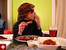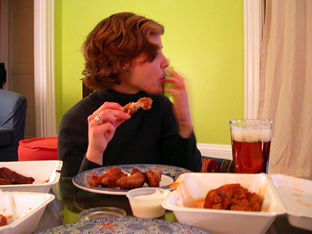 once julie came over, it was time for sports night, with all the necessary ingredients: a baseball game, wings, and beer. she had brought three difference flavors of wings: medium (regular), rochester, and spicy barbecue. pouring the anchor steam into drinking glasses, julie explained the difference between good head and head that is otherwise not so good. she hadn't had wings in a long time, and i never thought she was the kind of gal who does wings very often even though she certainly likes her beers. however, this evening she had a ravenous appetite for said chicken parts, and after she consumed her share, she was scooping up the sauce and gnawing at the bones and she might've even drank the blue cheese when i wasn't looking. for someone who doesn't frequently do wings, she certainly seemed to love them.