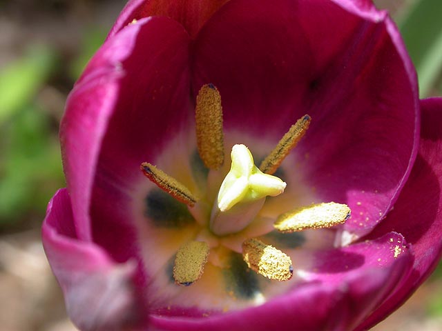 the white petals of plum flowers blew off the trees like snow. the dandelions were out in full force, and would need to be dealt with otherwise there'd be serious repurcussions during the summer season. one of our backyard neighbors continue to build new additions to their home, erecting a new fence for some privacy against their next door neighbors, even though from our house we can still easily see them, and come summer, when the leaves come out, they won't have any sun thanks to the trees growing in our backyard. i saw the purple tulip which was advertised as blue when i first bought it many years ago. however, there were no signs of the blue anemones, but i think they're may blooming flowers.