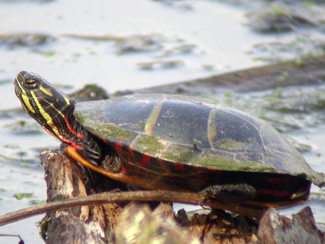 in the murky water occasionally i could spot a painted turtle swimming gracefully, and on outlying logs, they'd climb out of the water to sun themselves. turtles are also common enough that they didn't peak my interest. what i really wanted to see was a watersnake, and i kept on eyes glued to the surface of the water, looking for any signs sof movement.