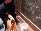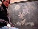 so we sat on the floor, a special booth for kids, chalkboards on the wall and a bucket of colored chalks (which wasn't really colorful if you ask us, the lines always came out pretty much white). i drew a red eft, the object of my obsession, while renata made an ultra happy summerscape, with flower and sun and grass and even a butterfly that smiles. i wrote out an algebraic formula, which induced renata to admit she hates math.