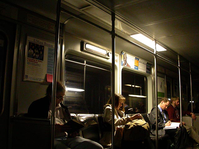 the train out of south station was special. there was some sort of malfunction with the lights in the cabin i was riding in, so only some of the lights were on, saturating everything in a moody dimness. the lack of strong flourescent lights had a calming effect, everyone was quiet, lost in thought, the lucky few going home around 4pm.