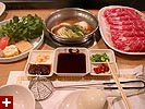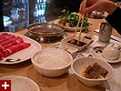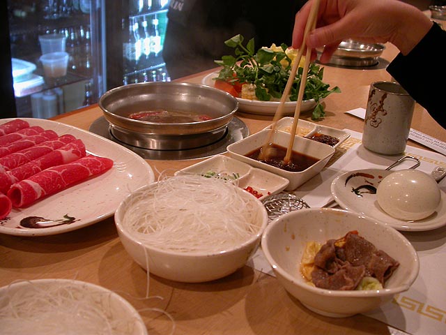 i went with the lamb, renata had the beef, we both went with the "chinese spicy" broth addition, which is just schezuan ma-la paste. renata requested a mild, which we'd later found out there's no such thing. my technique for eating hot pot is to throw everything in all at once. i like eating it, but i have no patience for cooking my own food when i eat at a restaurant.