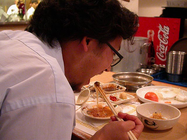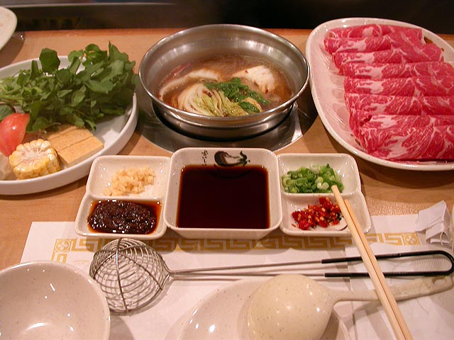 the woman loves "chinese spicy" but can't eat it anymore on the account that she's allergic to the ma-la. so tonight she had the kim-chee while her husband went with the tom yum. they talked about how whenever they come, they see asians (they themselves being white devils) eating their hot pot just plain, no spicy additions, and were delighted that renata and i decided to go with "chinese spicy", so they didn't feel like they were doing something wrong. "oh, once you go spicy, you can't go back," i told them from personal experience.