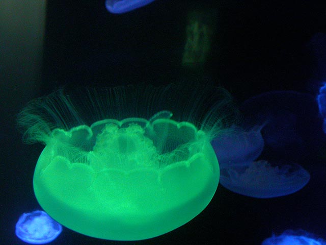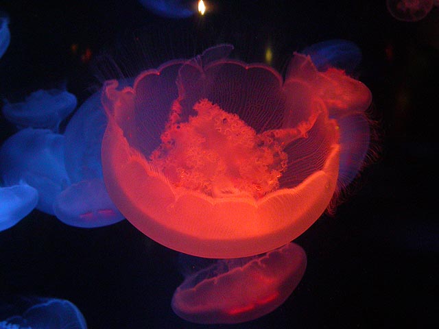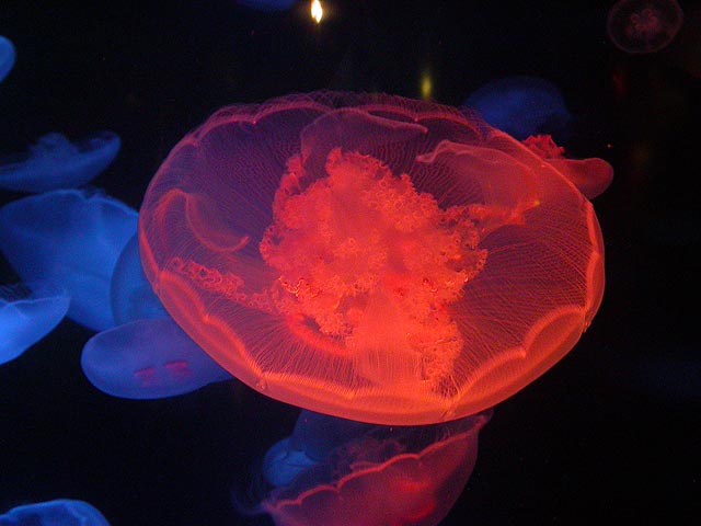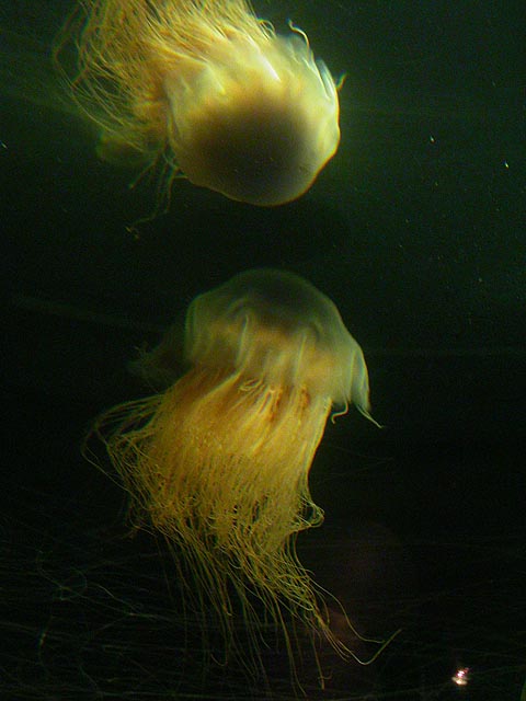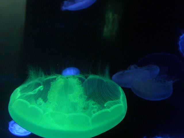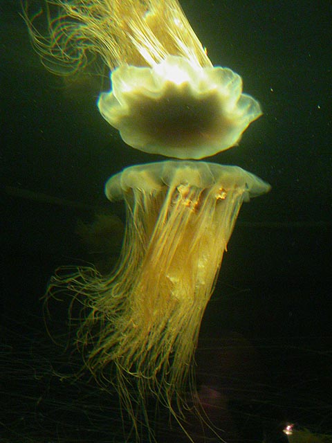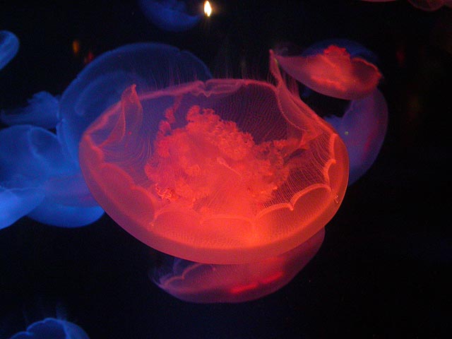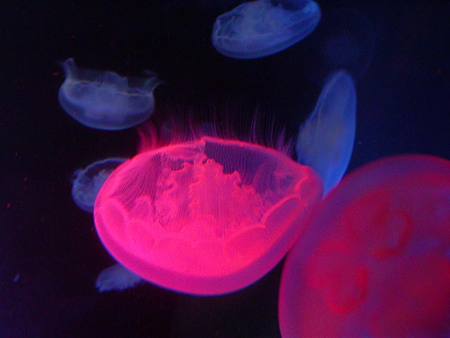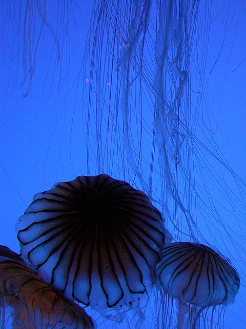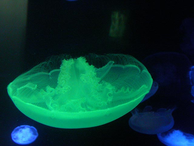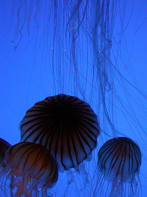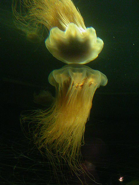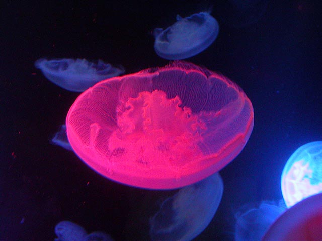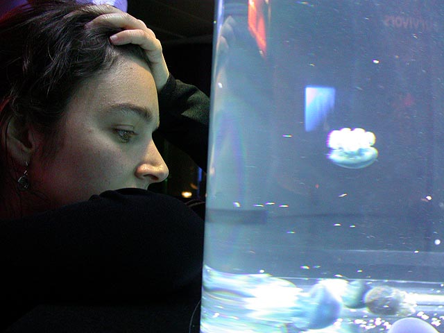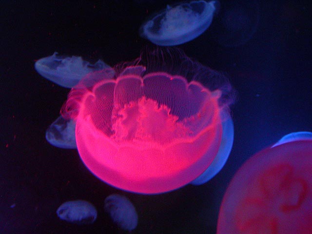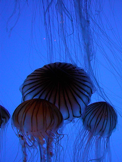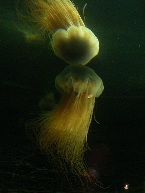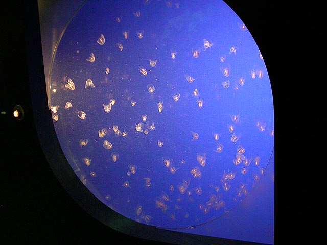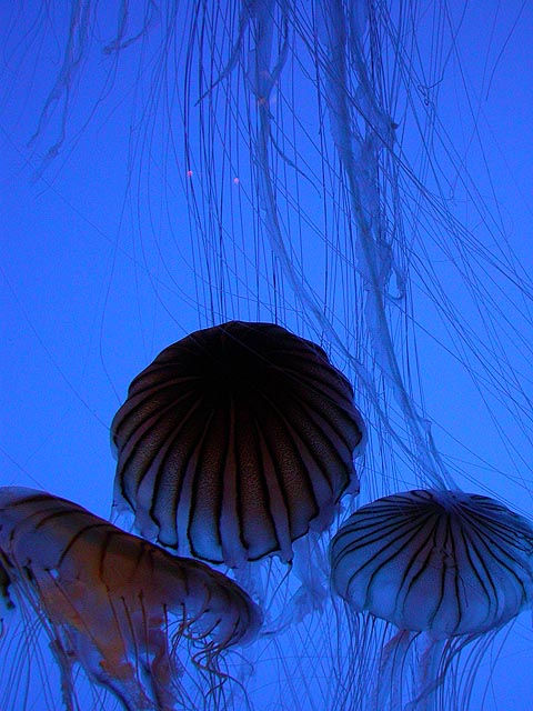 despite the expensive ticket price ($15/person). if you haven't visited the aquarium in a while, you owe it to yourself to check it out now, particularly the jellyfish. i was able to get in because the aquarium had a special reception for those who worked on the exhibit: squid made the jellyfish game, i programmed the interactive. i can't even begin to describe the things i saw tonight. i could watch jellyfish swim for hours, suspended in the water, slowly drifting, pulsating, some even bioluminenscing, it's breathtakingly beautiful. when you leave you'll want a jellyfish tank of your very own!