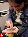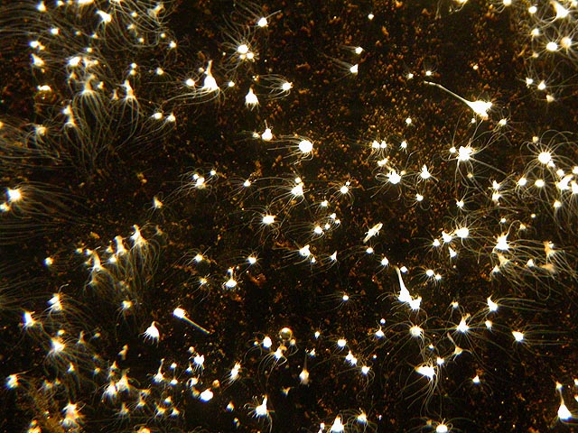 another display allowed you to use a magnifying glass and examine jellyfish polyps, which resemble tiny white hydras. the japanese sea nettle were displayed in a long blue tank embedded in the wall, like a huge flat screen television broadcasting high definition video of jellyfish. these had very long tentacles as well, and the bells reminded me of translucent mushroom caps. it was very soothing to press your face up to the glass and just watch the sea nettle seemingly dancing in the water.