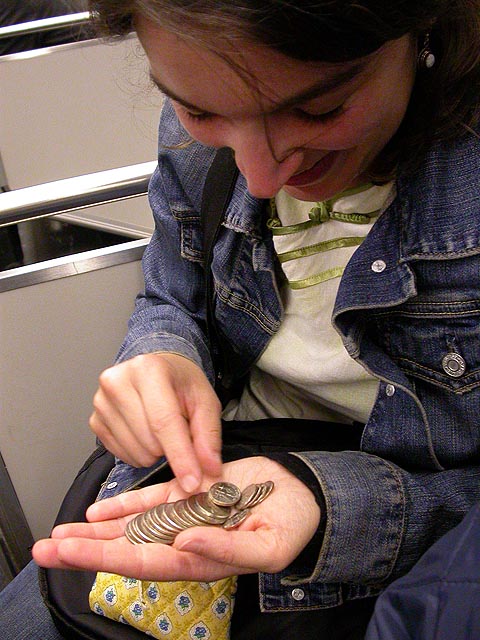 i told her i had some money but she wouldn't hear of it, determined to pay in a fistful of loose coins. finally she accepted some dollar bills in exchange for some quarters, noting that i could always use more quarters. she wanted me to tell her again how to say "son of a turtle" in chinese, and when i refused (i don't need her to sully my language), she had a tantrum. approaching porter square, i said my good byes, we embraced, and i told her what she wanted to know before i left the train.