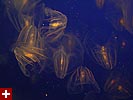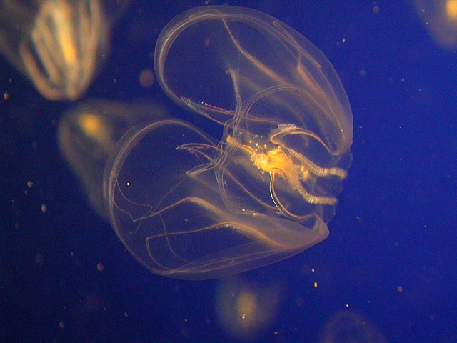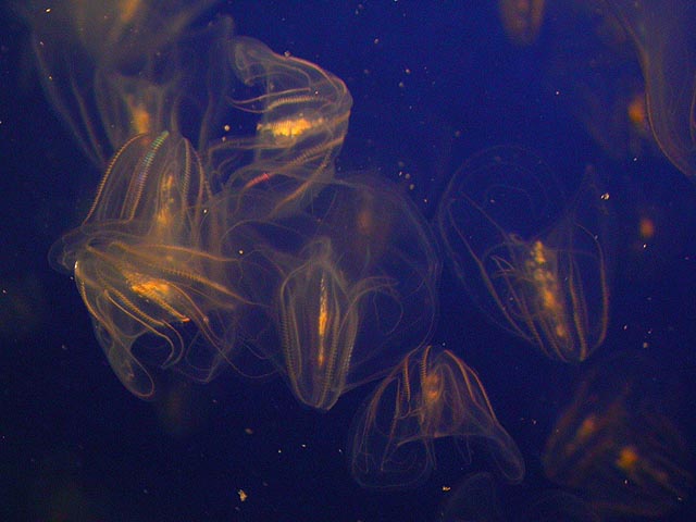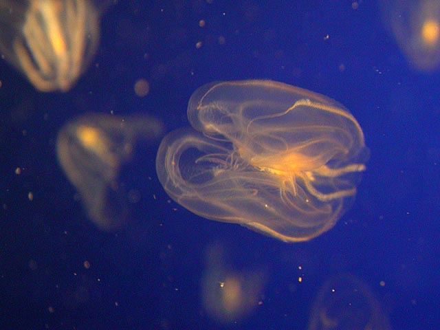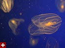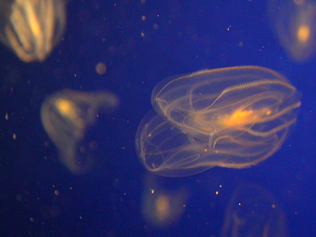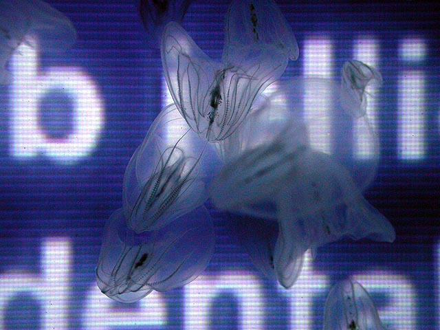 the last jellyfish we saw were the sea walnuts, which the aquarium actually has on permanent display in their main exhibit hall. they do have a walnut shape but that's not what's cool about them. the amazing part is their non-stop bioluminescent pulsations, more mechanical robots with blinking lights than organic living creatures. they were displayed in front of a television screen that would run a quick video about them, and it's cool watching the screen through the translucent jellyfish.