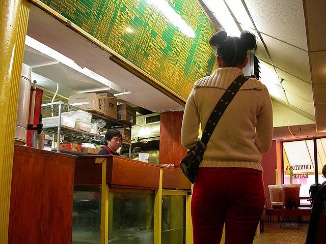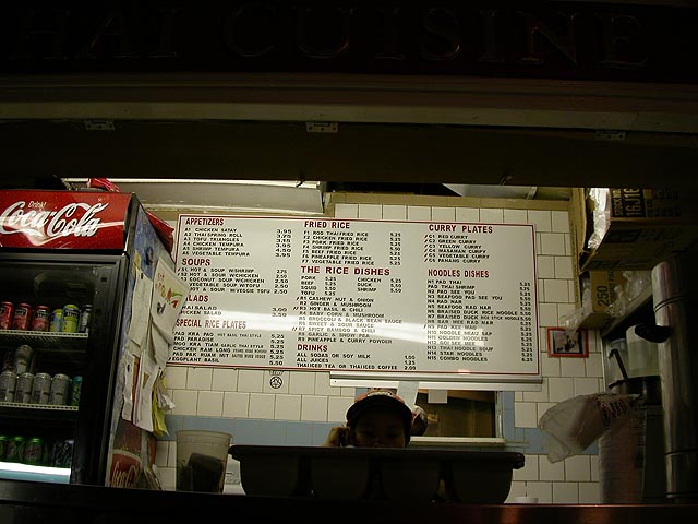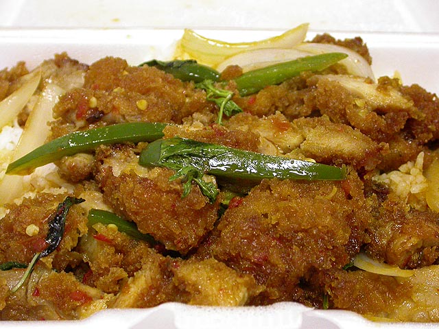 i wanted to go running, but after the meeting, the sky went scary dark, and it looked like it'd rain any minute, which it did. i decided to do some grocery shopping instead, first going online and finding a recipe to make for dinner tomorrow night (mee krob, or thai crisp fried noodles). later, i went to the upstairs chinatown eatery and got some thai basil chicken from rod thai. the chinatown eatery has a real seedy quality about it. i've seen cockroaches climbing the walls and one time mandy swore she saw a mouse run across the floor. nevertheless i keep on coming back because it's convenient and fast. it wasn't very fast today however, but i waited patiently, my folded umbrella dripping water on the floor, one arm propping up my head, watch some other people eating. a few times the thai chef would smile at me from behind the kitchen and nod, reassuring me that my food would be ready soon. when i got back to the office and tried the thai basil chicken, it was surprisingly good. the serving was way too much though, i ended up finishing all the chicken and tossing the leftover rice.