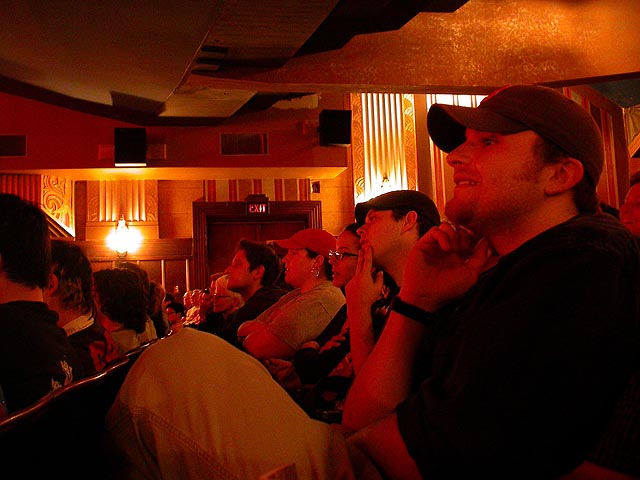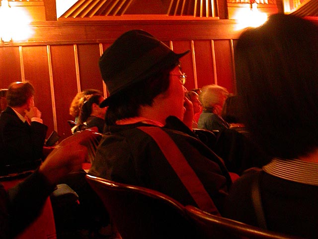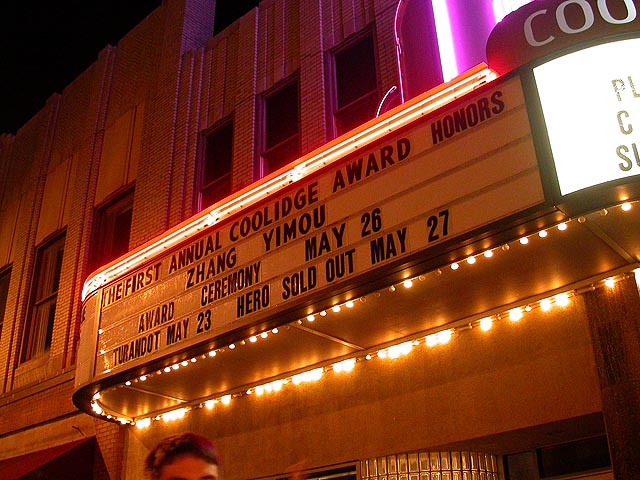 after work i took the c train from park street to coolidge corner in brookline, for the advance screening of hero, a film by zhang yimou, who was presenting the movie and taking questions afterwards. right when i got off the train (6:45), my godmother's son alex called me, asking me if i could save him a seat, since through pure coincidence he was also attending the screening as well. reluctantly i said yes, even though i don't like saving seats for sold out events. at the theatre, there was already a long line snaking around the the building. i got in line and called joel, who was looking for a place to park his jeep. soon after he showed up, dan got there as well, having taken the 66 bus from harvard square. i liked the idea of the three of us taking three different mode of transportation to get here, train, bus, and car.