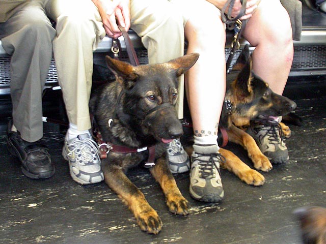 i rode the train this morning with a pack of german shepards, seeing eye dogs in training. they were very obedient, lying down quietly on the floor beneath the seats. a pair of cops entered the picture, didn't quite catch on as to the true nature of these canines, and after some suspicious looks, finally asked one of the handlers, "what's with the dogs?"