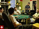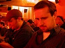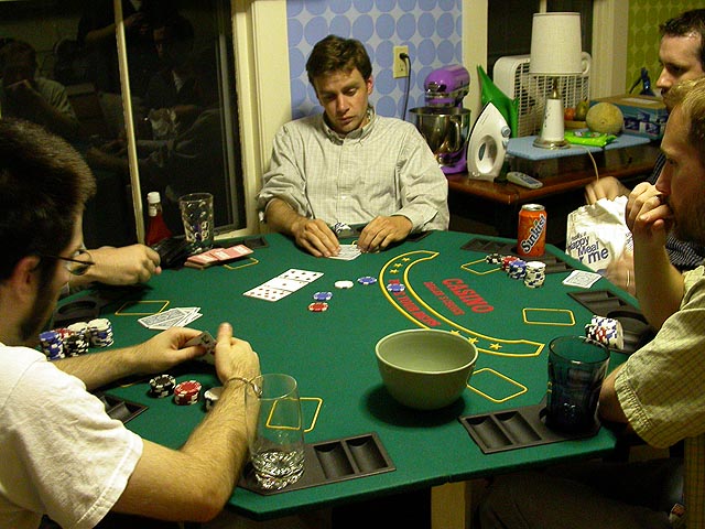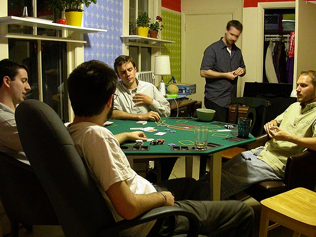 the boys were huddled around a polygon poker table set up in the kitchen. bob was the big winner tonight, as indicated by the tall stacks of chips in front of him. rob house, who was unstoppable the last time i saw him, appeared more mortal this evening. while they gambled, joel and i stood around and watched for a little bit, before i left with joel and got a ride back to my place, 11:30.