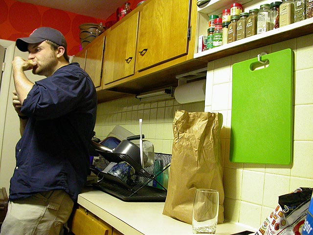 the show was finally over and we left the theatre. i talked with alex for a brief minute before he left. while joel went to get money, dan and i went across the street to get some takeout from macdonalds. there were a few tables of elderly brookline residents who eyed us suspiciously (you'd think they'd be used to the freaks by now, with the coolidge corner theatre next door). we followed joel to boca grande where he got a burrito before we all climbed aboard his jeep and headed up to cambridgeport in central square, to elias' house, where he was hosting poker night.