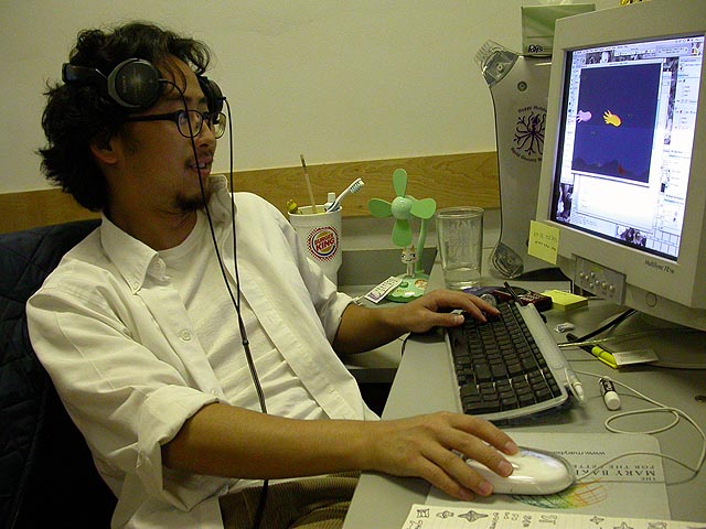 maybe i should do that since there isn't very much for me to do, but i rather save my personal days for when it really counts, like a nice summer day that i can sneak away and go to the beach. i'd been entrusted with the task of taking photos of people working for the promo cd, everyone was willing go along with it except one person who shall remain nameless. around noontime kristine asked if i wanted to go running, which i said yes,