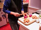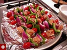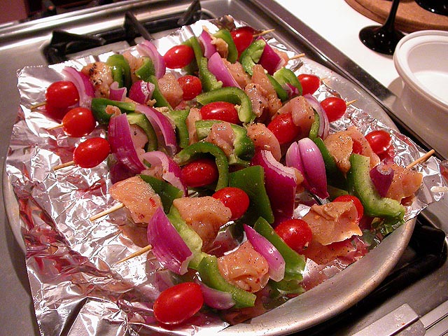 julie made kebabs tonight, showed up with pre-marinated chicken she bought at the supermarket. after she cut up all the ingredients, we skewered them and threw them